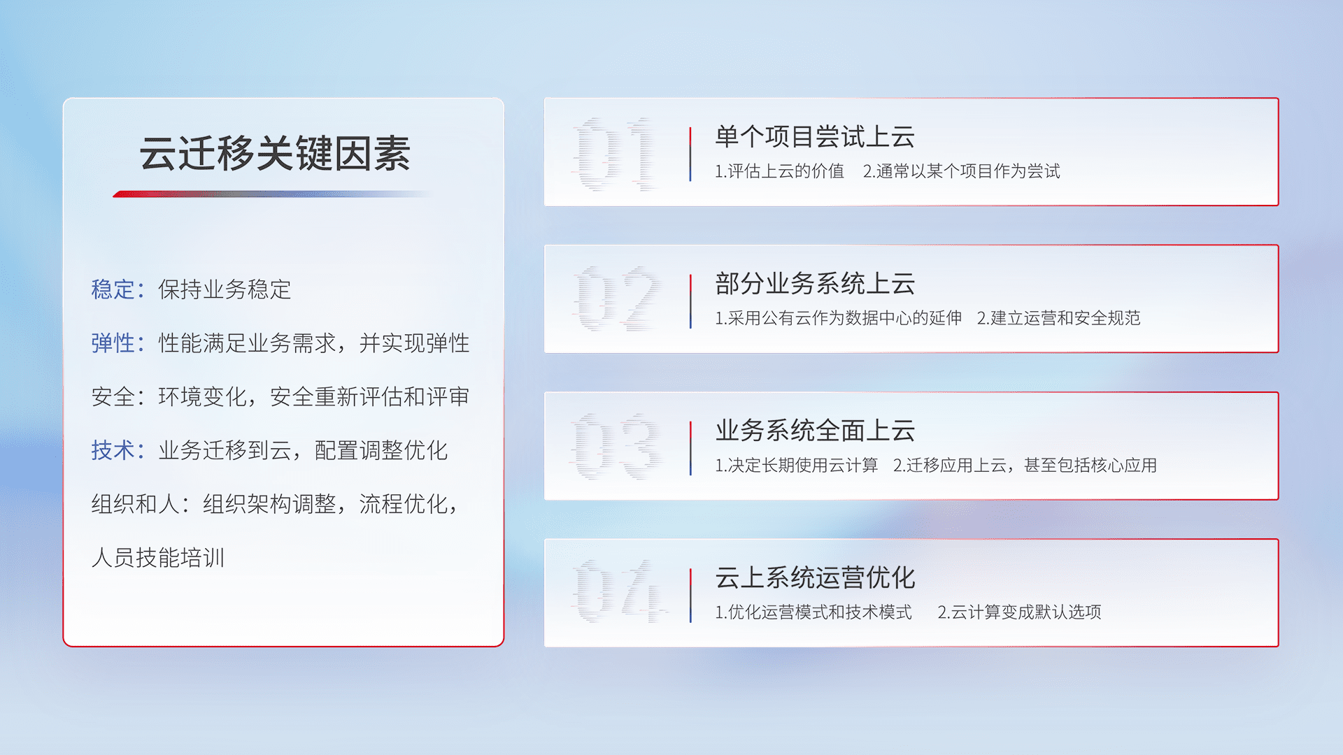 结合实际业务,,,从规划设计、、、云平台选型、、、、云原生改造、、、、数据迁移、、、集成交付,,迁移全过程为客户识别最佳上云路径,,,做好风险识别管理,,设计网络架构、、、、身份权限、、安全审计合规、、、、操作审计、、、、日志审计、、监控告警策略、、、多站点容灾设计等,,对云上基础设施进行整体规划,,,,提升IT治理水平,,,,以满足弹性、、、、高可用、、、、高性能的需求。。。。